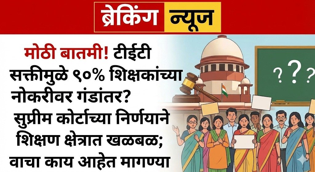 देशातील आणि विशेषतः महाराष्ट्रातील शिक्षकांसाठी एक चिंताजनक बातमी समोर आली आहे. शिक्षक पात्रता परीक्षा म्हणजेच TET Exam (Teacher Eligibility Test) अनिवार्य करण्याबाबत सर्वोच्च न्यायालयाने दिलेल्या निकालामुळे लाखो शिक्षकांचे धाबे दणाणले आहेत. जर हा नियम जसाच्या तसा लागू झाला, तर राज्यातील सुमारे ९० टक्के शिक्षकांना आपल्या नोकरीला मुकावे लागण्याची भीती निर्माण झाली आहे.